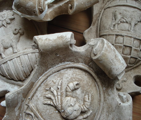 eines persönlichen Wappens dargestellt. An jedem Wappen befindet sich ein Anhänger, der die jeweilige Zeit, Engelstunde, die Farben und die Pflanzengruppen des Sternzeichens benennt. Die Patina kann bedingt durch das Material und die Handarbeit gegenüber der Photodarstellung eventuell leichte Abweichungen zeigen. Ein Loch auf der Rückseite dient zur Aufhängung. Zu den Sternzeichen: bitte in das Bild klicken. |